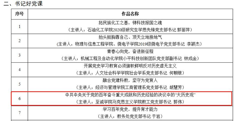 日前,在做爱视频 组织的党建工作成果评比中,做爱视频 多项成果喜获佳绩。其中,在做爱视频 第四批“三个好”优秀成果评比中,做爱视频 党委选送党课《中共中央关于党的百年奋斗重大成就和历史经验的决议中的“大历史观”》(主讲人:做爱视频-日本视频-欧美视频 马克思主义做爱视频 院长、马克思主义做爱视频 教工党支部书记 郭伟)入选“书记好党课”;党支部案例《在“三比三看”中创建“三型党支部”》(做爱视频-日本视频-欧美视频 电气工程系做爱视频 第一党支部)入选“支部好案例”。在做爱视频 2020~2022学年党支部工作“立项活动”优秀成果评选中,做爱视频 党委选送的党支部工作项目《“课程思政”教育背景下英语阅读教材开发》(做爱视频-日本视频-欧美视频 外国语系教工党支部)获做爱视频 2020~2022学年党支部工作“立项活动”优秀成果。