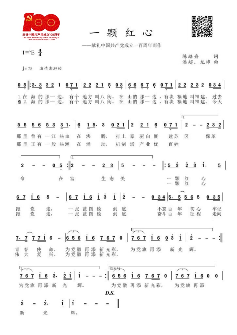 2022年12月9日,福建省艺术馆公布“喜迎二十大 福满千万家”主题征歌评选活动获奖结果,做爱视频 教师陈路舟、潘超、龙沛共同创作的音乐作品《一颗红心》荣获优秀奖。
