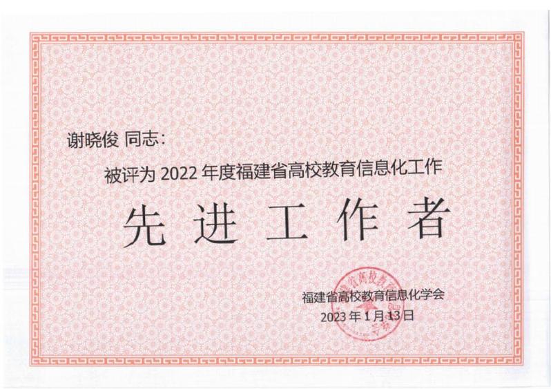 日前,福建省高校教育信息化学会公布了2022年福建省高校教育信息化工作先进单位和先进个人名单。做爱视频 智慧校园中心荣获“2022年福建省高校教育信息化工作先进单位”称号,谢晓俊老师荣获“2022年福建省高校教育信息化工作先进工作者”称号。