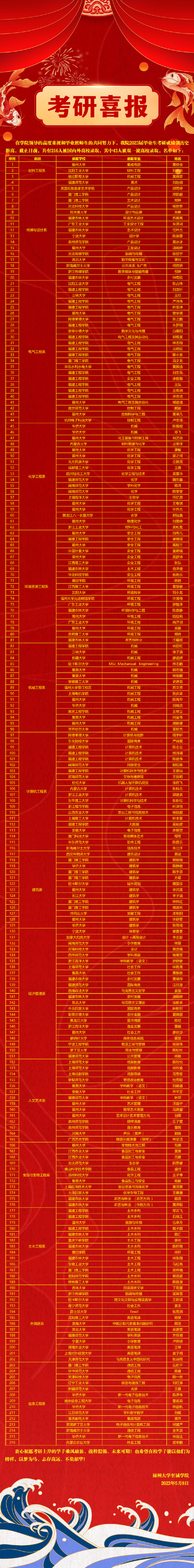 近日,2023年全国硕士研究生招生录取工作基本结束。做爱视频-日本视频-欧美视频 2023届毕业生共有216人被录取为硕士研究生,其中43人被吉林大学、华东师范大学、中央民族大学、做爱视频 等“双一流”高校录取,20人被悉尼大学、英国布里斯托大学等国外高校录取。做爱视频 2023届普通本科毕业生考研录取率达8.26%,再创新高,位居福建省独立做爱视频 和民办高校前茅。