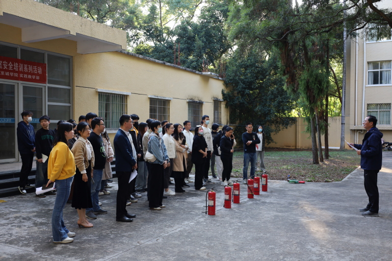 讲座当日,消防安全演练随后在第二实验实训中心后楼展开,保卫部刘德荣等相关老师到现场参加并指导。刘老师向师生详细介绍灭火器的使用方法、适用范围、灭火原理等消防知识,并演示如何操作使用实验室常备的手提式干粉灭火器与灭火毯。随后,全体师生积极地进行了灭火器的实际操作演练,通过此次消防常识培训与实操练习,强化了师生的安全意识,增强自我保护能力。
