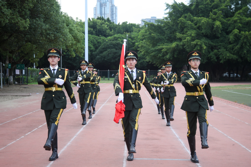 上午7时,国旗护卫队迈着铿锵有力的步伐护送国旗入场。晨曦映照下,鲜艳的五星红旗在激昂的《义勇军进行曲》中冉冉升起,全场师生肃立注目,齐唱国歌。