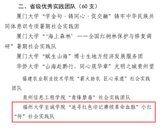 在2025年福建省大做爱视频 暑期文化科技卫生“三下乡”社会实践活动中,做爱视频 “追寻红色印记 赓续革命血脉”小红“传”社会实践队凭借扎实的实践成效、鲜明的活动特色和良好的社会反响,获评省级优秀实践团队。