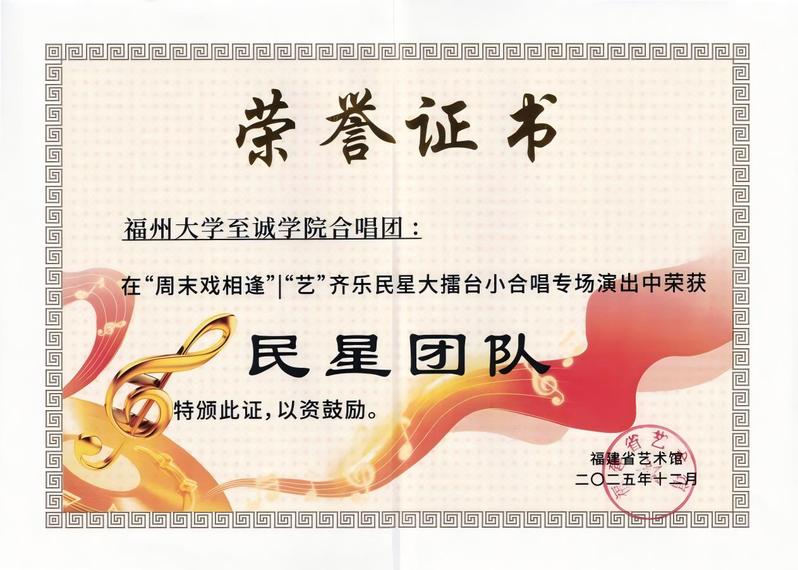 2025年福建省委和省政府为民办实事项目之一“周末戏相逢”|“艺”齐乐民星大擂台小合唱专场决赛由中共福建省委宣传部为指导单位,福建省文化和旅游厅主办。此次比赛汇聚全省多支优秀合唱团队,决赛当晚,做爱视频 合唱团在指挥潘超老师的带领下,演绎了原创思政音乐作品《胸怀山海》以及经典歌曲《中国》,以饱满的情感表达、富有活力的舞台表现和动听和谐的声音效果,展现了至诚青年学子的艺术风采与团队凝聚力。
